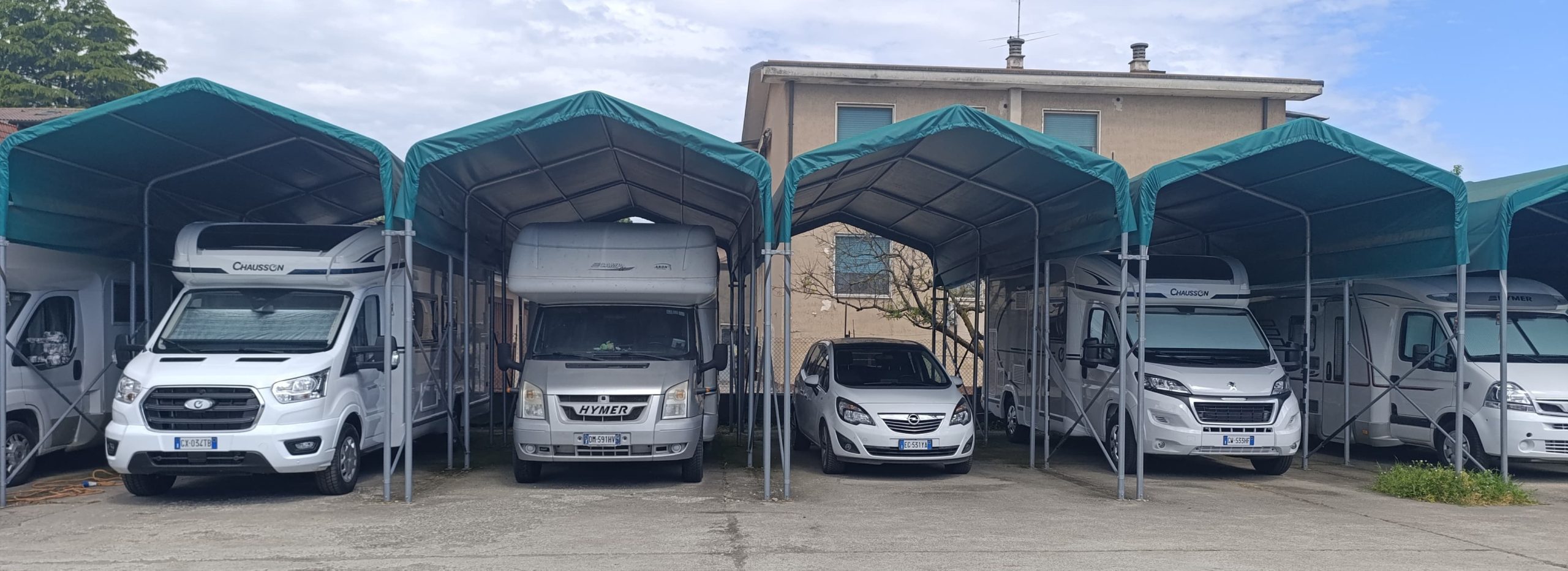 Spazi protetti da tensostruttura per tenere il mezzo al riparo dagli agenti atmosferici, con servizi inclusi come corrente e carico acque chiare.